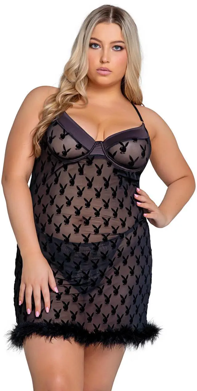 Chemise: - Play bunny logo flocked printed mesh stretch satin - Marabou trim - Plunge cup with underwire