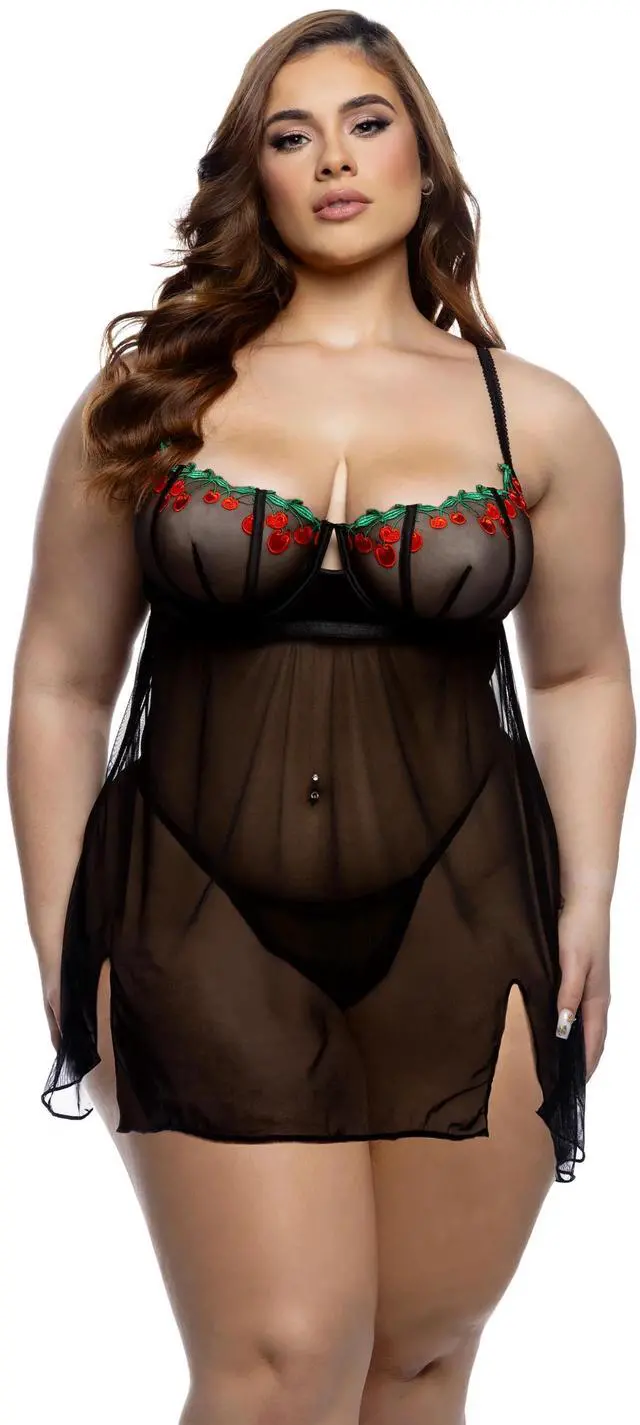 Babydoll: Embroidered cherry lace and mesh, Balconette cup with underwire, Split front skirt