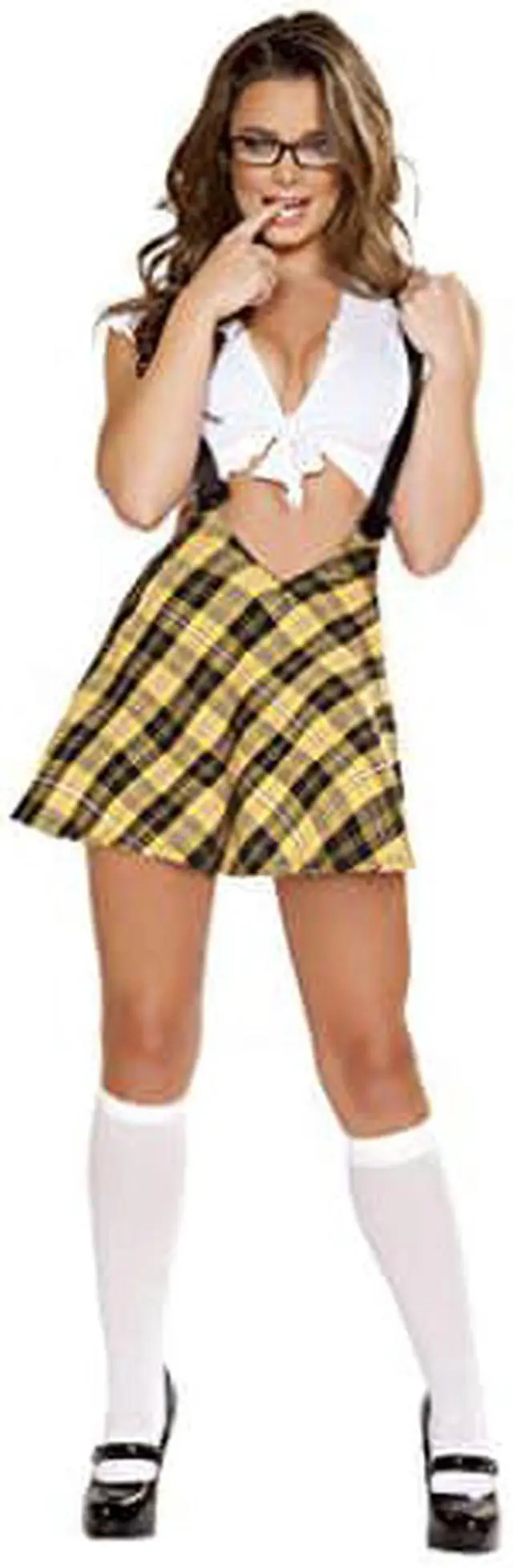 Earn extra credit in this plus size Tempting School Girl costume featuring a white crop top with a front tie closure, cap sleeves, a ruffled trim, black suspenders, and a high-waisted, yellow plaid skirt. (Glasses and knee high stockings not included. )