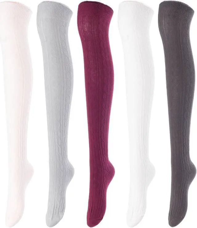 Lovely Annie Women's 5 Pairs Incredible Durable Super Soft Unique Over Knee High Thigh High Cotton Socks Size 6-9 A1024(Beige,LG,Wine,Cream,DG)