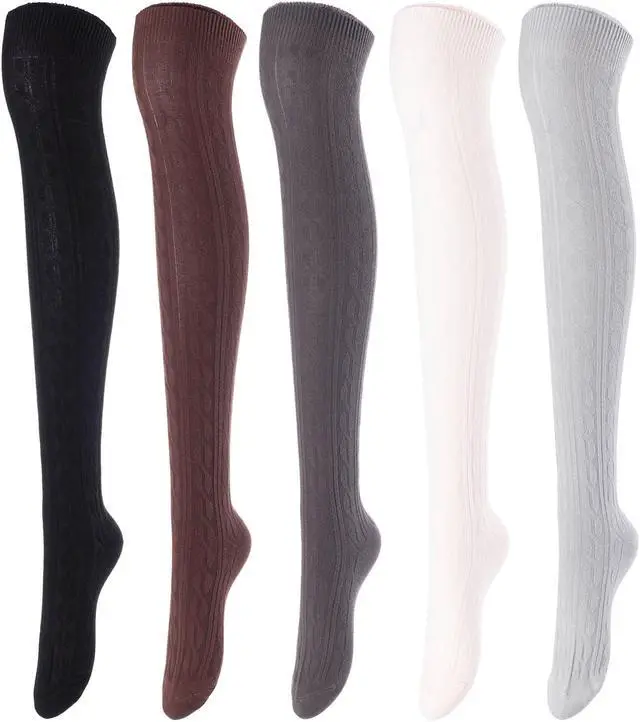 Lovely Annie Women's 5 Pairs Incredible Durable Super Soft Unique Over Knee High Thigh High Cotton Socks Size 6-9 A1024(Black,Coffee,DG, Beige,Grey)