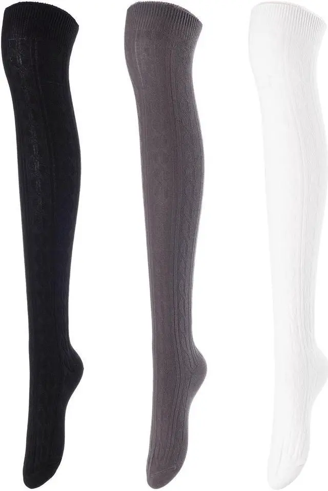 Lovely Annie Women's 3 Pairs Incredible Durable Super Soft Unique Over Knee High Thigh High Cotton Socks Size 6-9 A1024(Black,Dark Grey,Cream White)