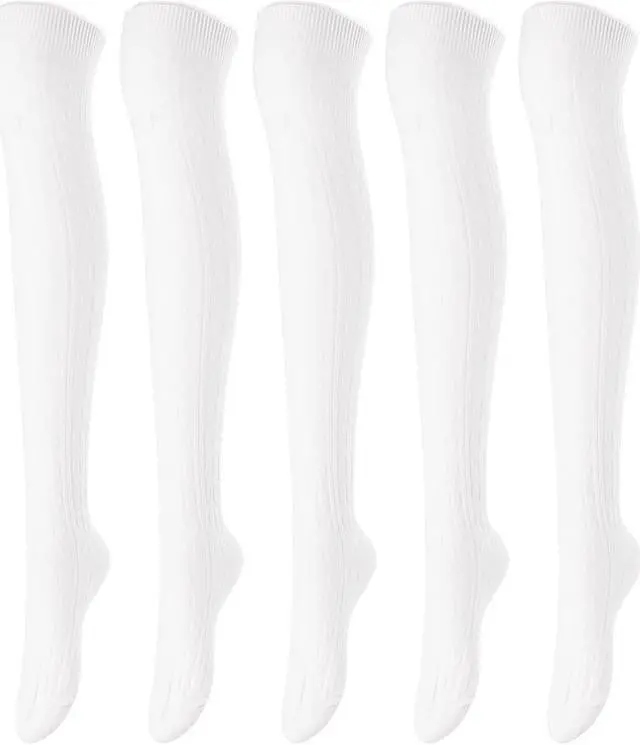 Lovely Annie Women's 5 Pairs Incredible Durable Super Soft Unique Over Knee High Thigh High Cotton Socks Size 6-9 A1024 (White)