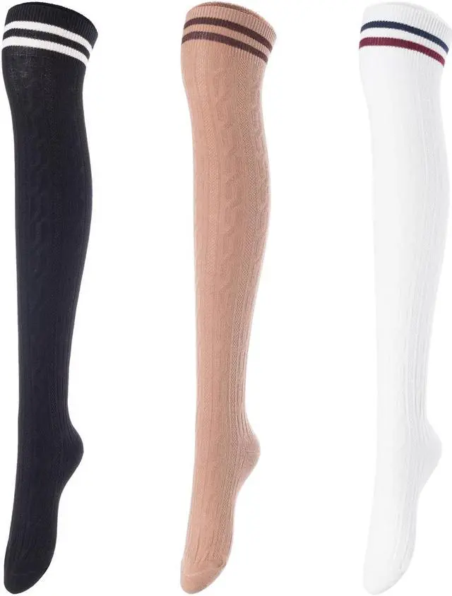 Lovely Annie Big Girl's Women's 3 Pairs Incredible Durable Super Soft Unique Over Knee High Thigh High Cotton Socks Size 6-9 A1023(Black,Kakhi,White)