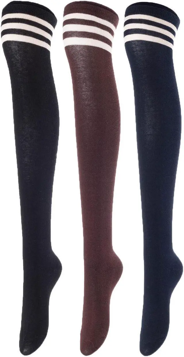 Lovely Annie Big Girl's Women's 3 Pairs Incredible Durable Super Soft Unique Over Knee High Thigh High Cotton Socks Size 6-9 A1022(Blk,Cofe,Navy)
