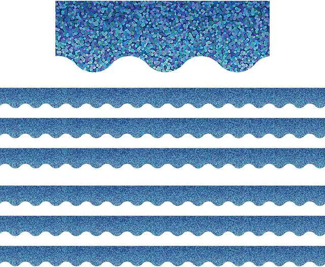 Add a little fun to your classroom with this beautiful Blue Sparkle Scalloped Border Trim. Use to frame student work, bulletin board displays, whiteboards, doors, or any place you want to add a little sparkle. Each pack includes 12 strips for a total of 35' of trim. Sold as 6 packs for a total of 72 pieces (210').