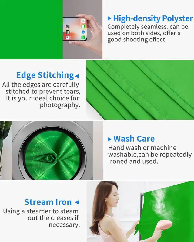 - Hemmotop green screen backdrop material is durable, can be cleaned in a washing machine for daily cleaning. It can be washed multiple times without fading. After washing, please smooth the green backdrop and lay it flat.