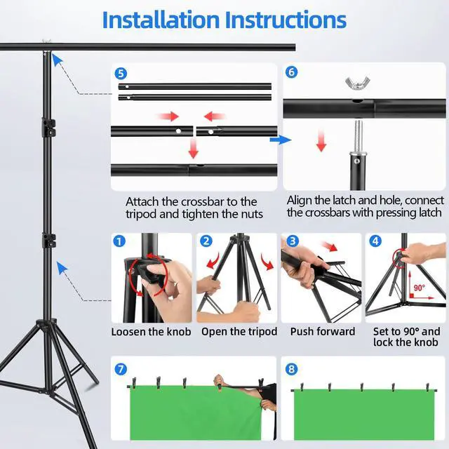- Adjustable T-shape backdrop stand is very easy to set up in only 2 minutes. And then just attach the green-blue screen to the support stand via the backdrop clip.