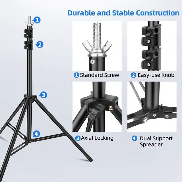 - Made of high quality matte steel material for stable and durable.The legs of the tripod stand can be set to 90 degrees,height adjustable from 2.6ft (80 cm) to 6.7ft (200 cm).