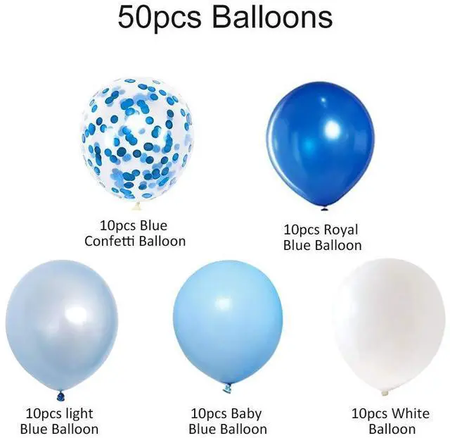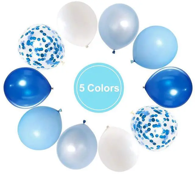 Material: latex & confetti Color: royal blue, light blue, baby blue, white and semi-transparent with blue confetti Individual size: 12 inch in diameter Both air and helium supported