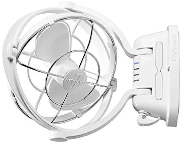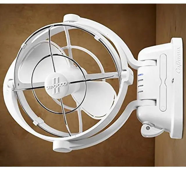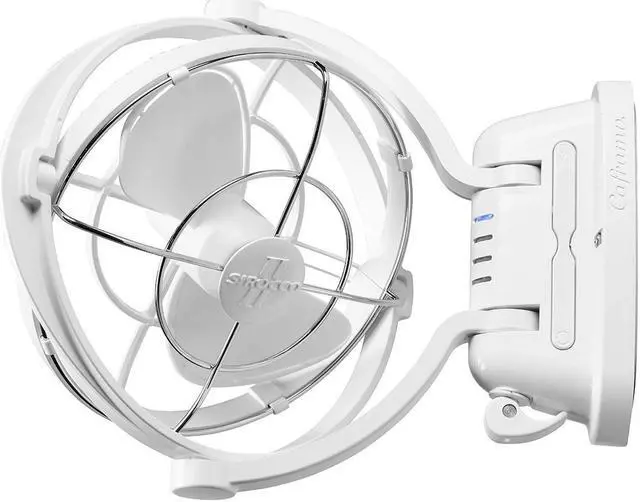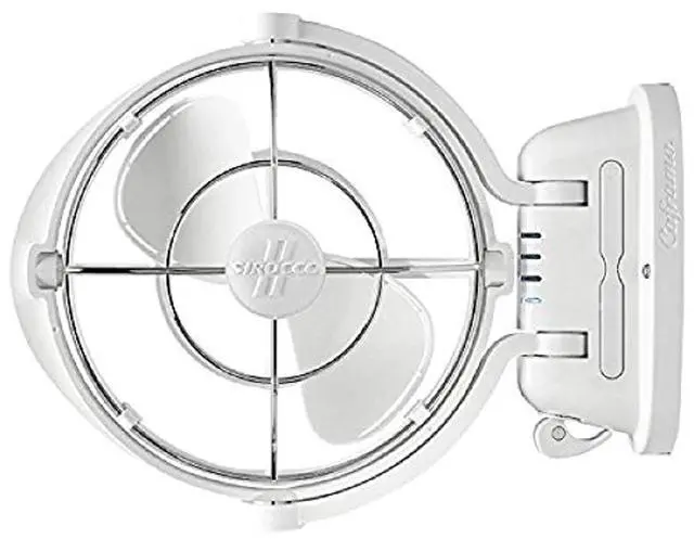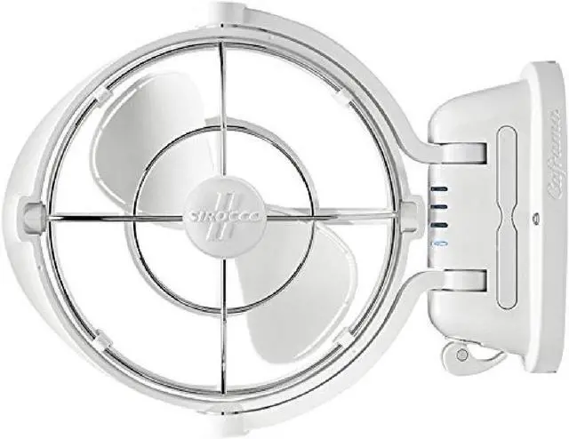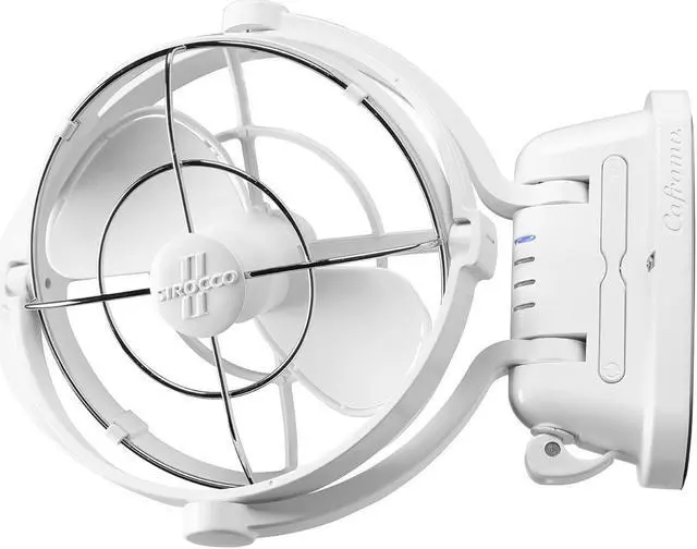Sirocco II 12 Volt 360° FanThe Sirocco II Fan offers increased durability, combined 12 and 24 volt capability, improved user interface, and increased timer settings. The Sirocco II is truly the next step in cabin comfort,The best cabin fan available in the marine market! The model 7010 Sirocco II 12-24 Volt fan features a unique gimbaled design that allows airflow to be directed in any direction of the cabin - 360°. The Sirocco II can also be folded flat and out of the way against the bulkhead when not in use. With its multiple speeds, timer settings and quiet operation there is no other marine fan that can match the Sirocco II's performance. It truly is the premium choice for comfortable cabins and salons.Features:Unique gimbaled designThree speed push button controlUltra quiet, long-life motorIncreased durabilityCombined 12 and 24 Volt autosensingImproved user interfaceFour preset timer settings (3, 6, 9 or 12 hours)Timer indicator lights and automatic dimmingStylish design available in a black or white finishBenefits:Allows full 360° rotation for limitless positioningQuiet, comfortable cabinsEfficient use of spaceBattery-friendlyMatches any boat interiorEasy to installSame mounting footprint as SiroccoMade in Canada