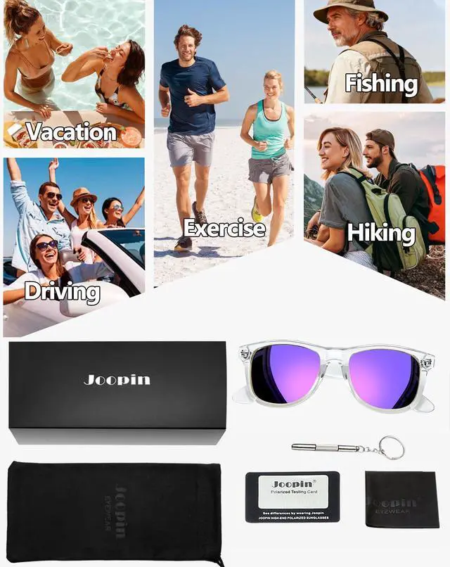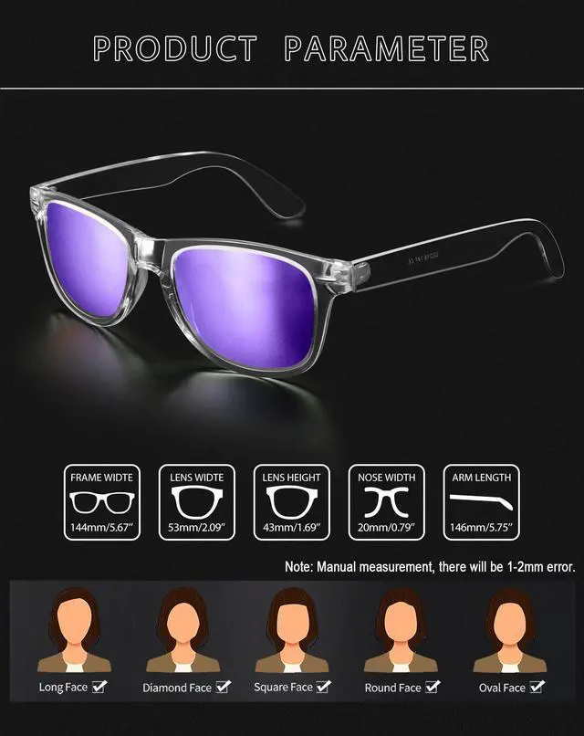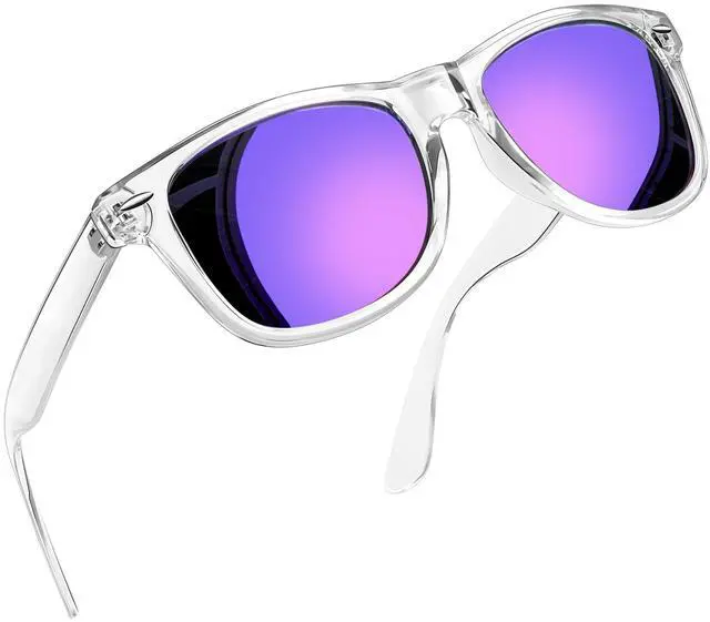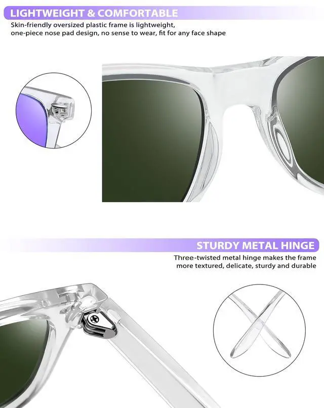 Transparent frame sunglasses offer a perfect balance of vintage charm and modern functionality. Designed with TAC polarized lenses, purple mirror sunglasses are used for reducing glare, used to protect eyes from harmful UV rays, and used as a stylish everyday accessory. The bold yet versatile frame of dark purple sunglasses is a must-have for those who value both fashion and practicality.