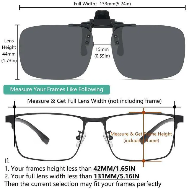 · To Make Sure These 180° Flip Up Clip On Sunglasses Can Fit Your Frames Perfectly, please read the following details carefully