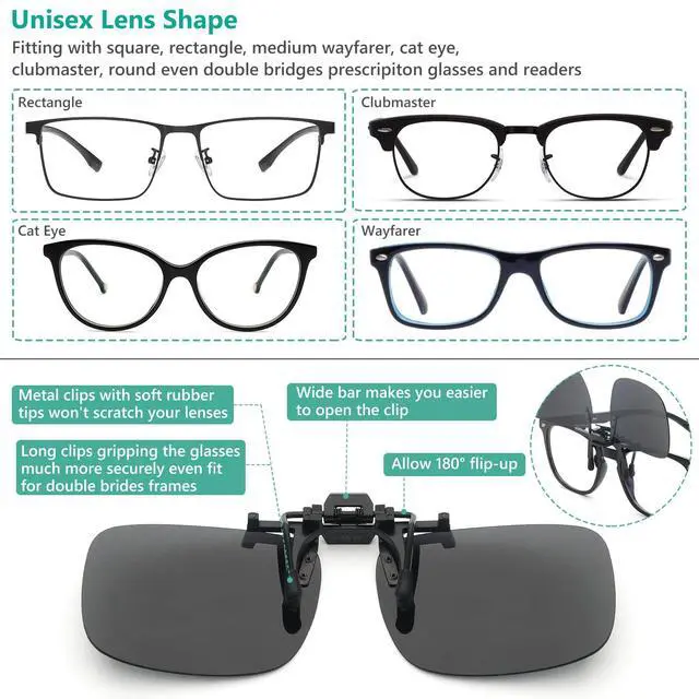 - These classic rectangular lens shape clip on sunglasses fits both prescription glasses and reading glasses, giving those people a good cover protection against sun light.