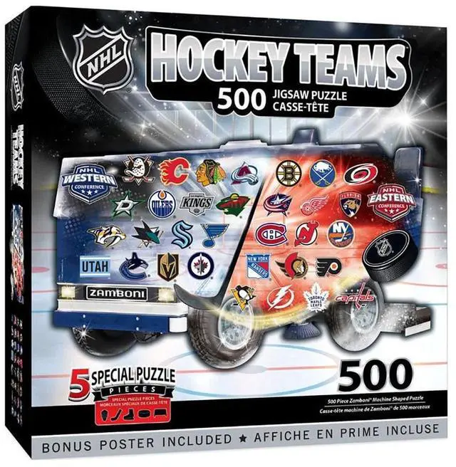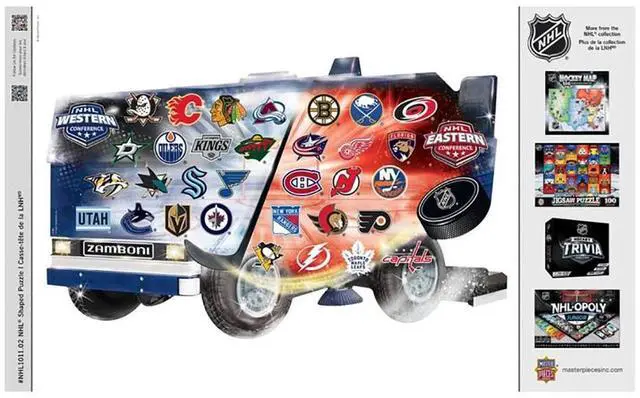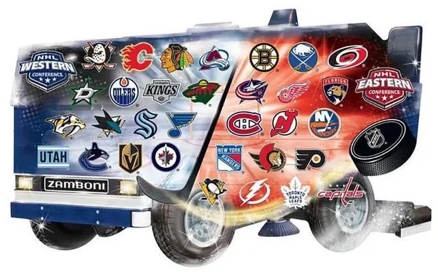 Fill game day with family fun by building the ultimate Zamboni shaped puzzle! Puzzle features all 32 Teams' logos. Keep the team spirit alive all year round!