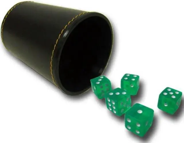Elevate your gaming experience with this vibrant set of 5 green dice, perfectly complemented by a stylish synthetic leather dice cup. Each die measures a standard 16mm cubed and features rounded corners for smooth rolling and easy handling. The vivid translucent coloring adds a touch of flair, making them not just functional but also a visually appealing addition to your game night. Whether you're playing tabletop games or just need some lucky dice, this set combines quality and style for any gaming enthusiast.