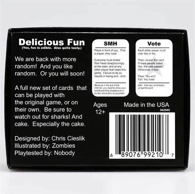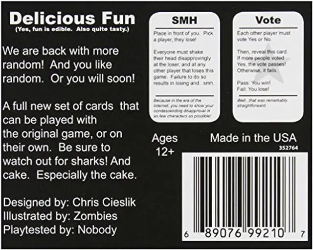 We are back with more random. And you like random. Or you will soon. A full new set of cards that can be played with the original game, or on their own. Be sure to watch out for sharks. And cake. Especially the cake.