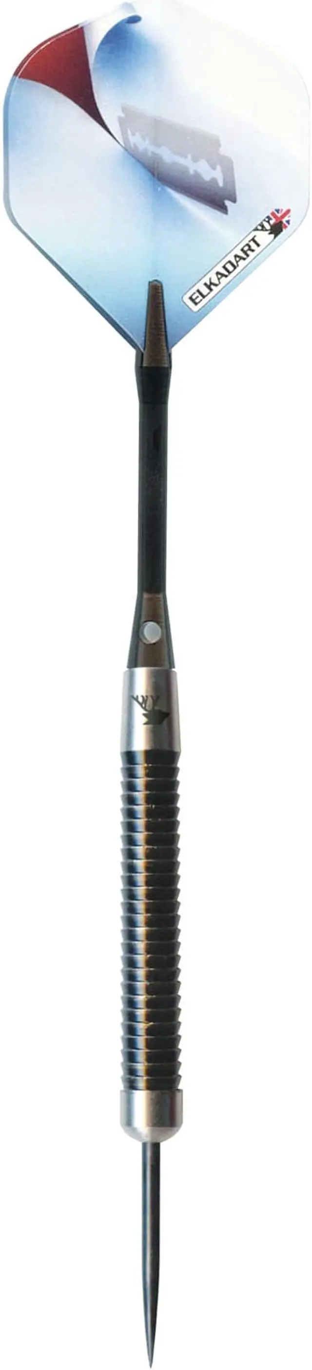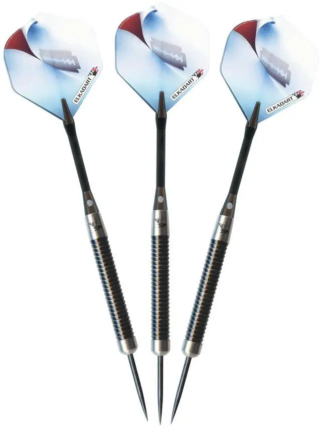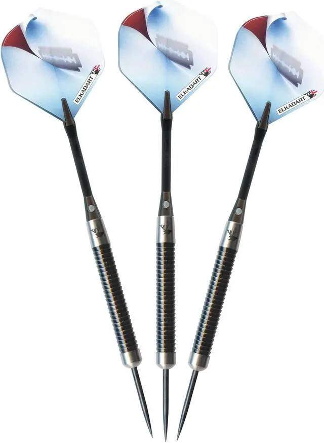 Cut to the chase and slice your opponents in twain when you bring the Elkadart Razor Steel Tip Darts, designed for use with sisal dart boards. These darts are packed with features starting with the barrel, fashioned from 80% Tungsten and 20% Nickel. Tungsten is a very dense metal, able to create slimmer darts with the same weight as lighter metals; this allows for tighter shot groupings without sacrificing control, increasing your scores. Tungsten is a sign of quality and durability as well because of its density. A higher tungsten content will produce a slimmer dart profile than one with less and 80% is among the highest youll find in dart set. More tungsten in the dart increases the price as tungsten is a rare metal and its density takes more effort to machine. The increased price gives a higher quality barrel and can improve performance, increasing scores. Each barrel possesses ridgeback grooves with a black oxide coating allowing your grip to remain precise throw after throw. The Razor Darts feature tough, lightweight aluminum shafts. These shafts feature locking holes that allow a more secure fit to your barrel; you wont find yourself retightening these shafts after a shot or two. Finally, each dart is finished off with the slicing razor graphic adorning each flight, for a sharp look on each dart. Each set includes three flights, three shafts, and a slim case. Made with pride in England.