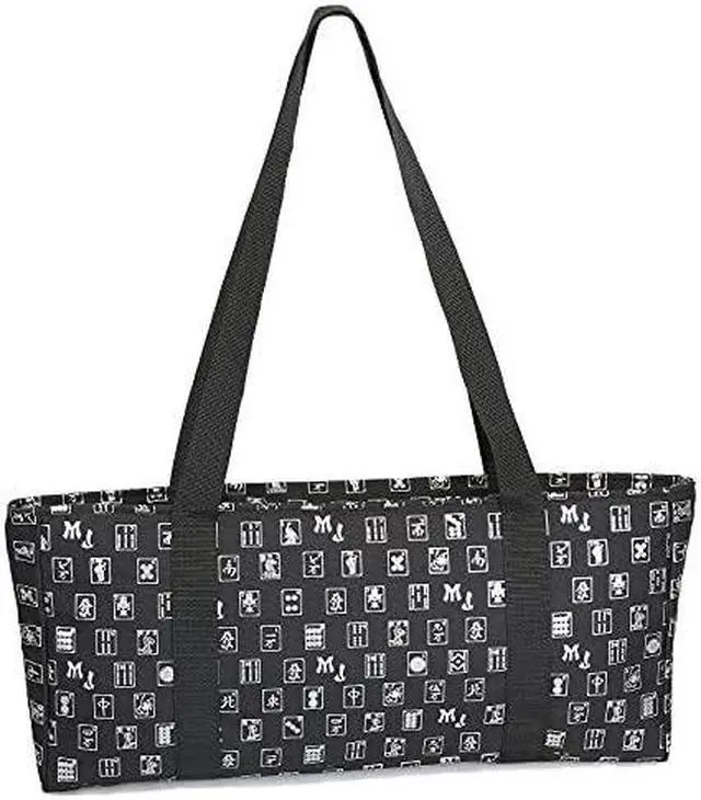 Black and Silver Mah Jongg Set Soft Carrying Case with shoulder straps, 2 matching velcro sleeve wrap for racks and tile trays plus a vinyl tile storage case. Case has a zippered closure and measures approximately 21" X 10" with large gusset for carrying full Mah Jongg set with racks.