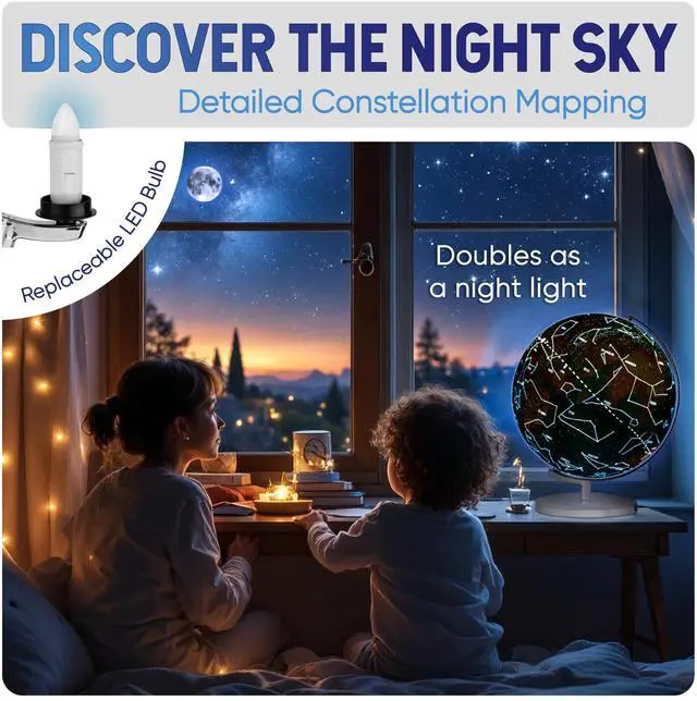 Explore the world like never before with our world globe with stand, a perfect blend of education and home décor. This rotating globe features vibrant political boundaries, cities, and natural landmarks, making it a valuable tool for learning. Turn on the globe night light to reveal a breathtaking constellation globe, displaying all 88 constellations in stunning detail. Whether you need globes for adults for reference or an interactive globe for kids, this multifunctional design enhances knowledge and curiosity.
