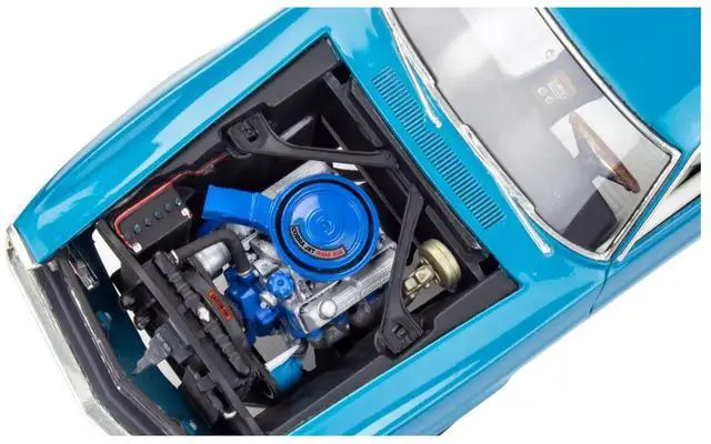 Highly detailed 428 Cobra Jet V-8 engine with a four-speed manual transmission.