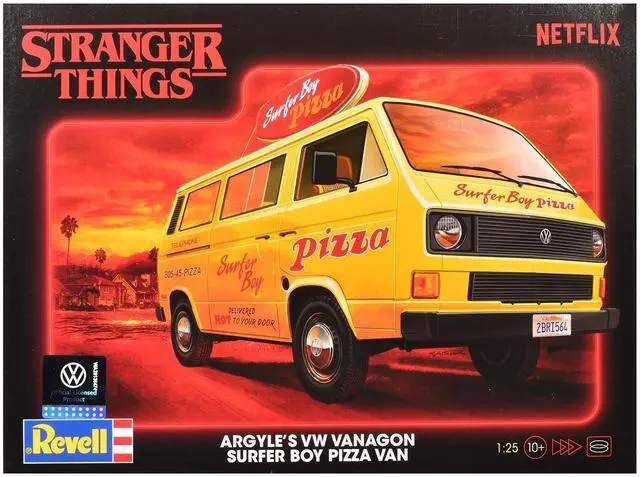 Brand new plastic model kit of Argyles Volkswagen Vanagon "Surfer Boy Pizza" Van "Stranger Things" (2016-Current) TV Series (Level 3) 1/25 plastic model kit by Revell.