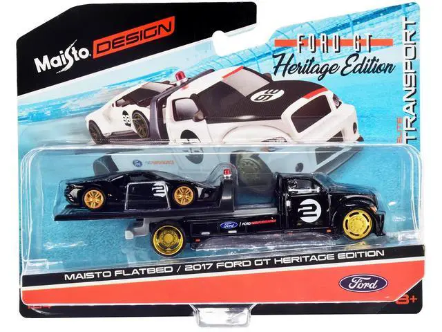 Brand new 1/64 scale diecast car models of 2017 Ford GT #2 Heritage Edition with Flatbed Truck Black "Elite Transport" Series die cast model cars by Maisto.