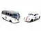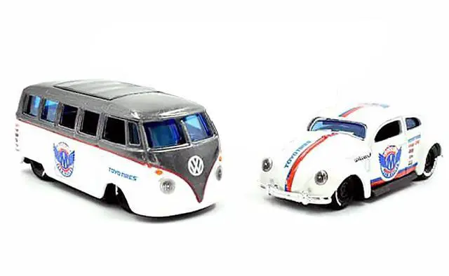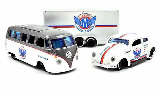 Brand new 1/64 scale diecast car models of Volkswagen Samba Bus Dark Gray Metallic and White with Volkswagen Beetle White Metallic and Enclosed Car Trailer Silver "Toyo Tires" "Team Haulers" Series die cast model cars by Maisto.