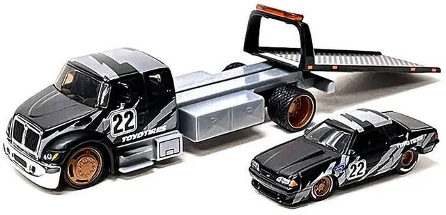Brand new 1/64 scale diecast models of International DuraStar Flatbed Truck #22 and 1988 Ford Mustang LX #22 Matt Black with Gray Graphics "Toyo Tires" "Elite Transport" Series die cast models by Maisto.