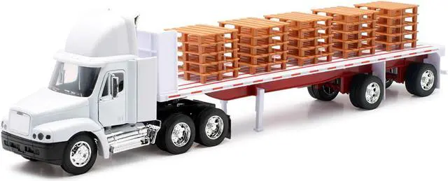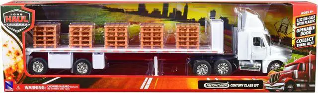 Brand new 1/32 scale diecast model of Freightliner Century Class S/T Flatbed Truck White with Pallet Accessories "Long Haul Trucker" Series die cast model by New Ray.