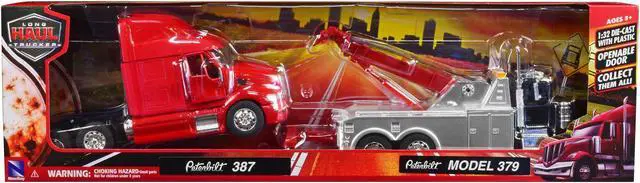 Brand new 1/32 scale diecast models of Peterbilt 379 Tow Truck Black with Peterbilt 387 Truck Tractor Red Set of 2 pieces die cast models by New Ray.