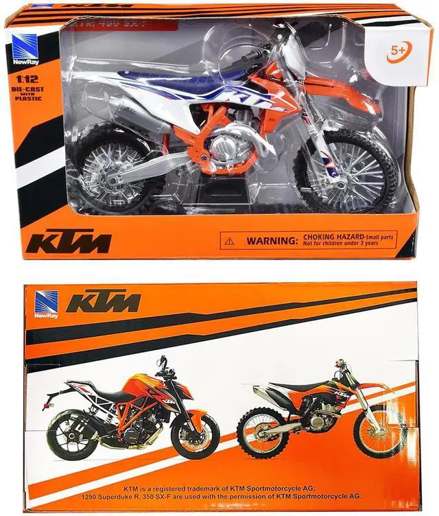 Brand new 1/12 scale die cast model of KTM 450 SX-F Dirt Bike Motorcycle Orange and White die-cast model by New Ray.