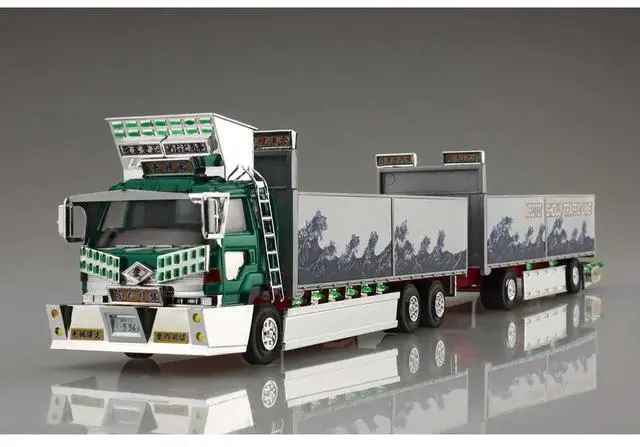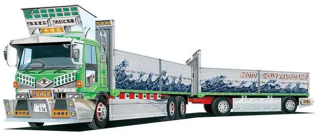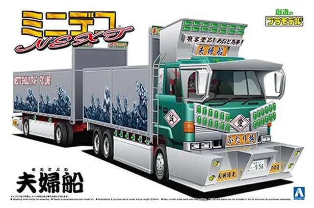 The 1/64 Mini-Deco Next series, with its cute palm-sized body and full-ship decorations, is the perfect introductory model series of decotoras?or "decorated trucks"?for younger generations. Build each model according to the instructions or create your own original decotora!This Michinoku set features a large flatbed full-trailer, panel and lantern stickers, detachable full-track chassis, detachable trailer, plated parts, and 18 tires for a full truck.