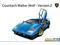 The Walter Wolf Countach Version 2 was built in 1976, one year after the birth of the first car. It's equipped with a 5-liter engine and exterior features include a rear wing and overfenders. This version of the Countach features a bright blue body and gold lines.