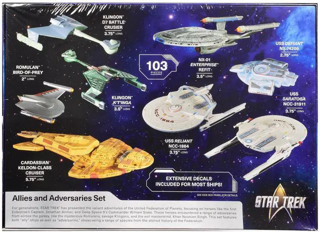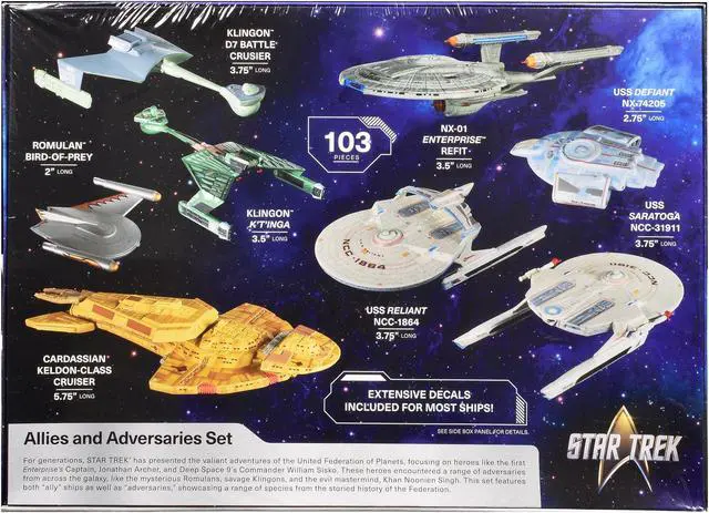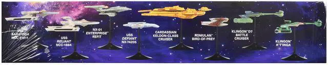 Includes the following ships: U. S. S. Defiant, U. S. S. Saratoga, U. S. S. Reliant, NX-01 Enterprise Refit, Klingon Ktinga, Klingon D7 Battle Crusier, Romulan Bird-of Prey, and Cardassian Keldon Class Crusier.