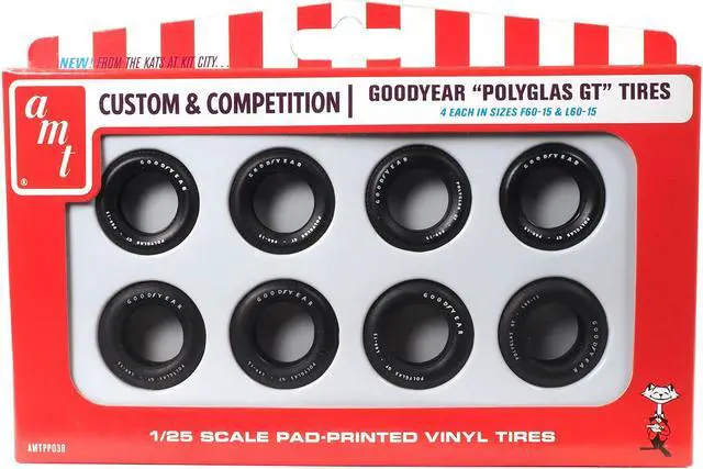 Brand new 1/25 scale plastic model kit of "Goodyear Polyglas GT" Tires Set of 8 Pieces for 1/25 scale models by AMT.