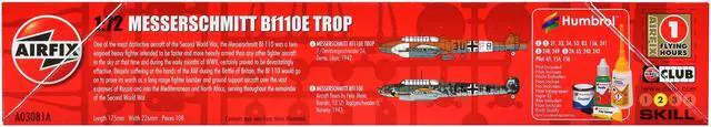 Brand new plastic model kit of Messerschmitt Bf110E/E-2 TROP Fighter Aircraft with 2 Scheme Options (Level 2) 1/72 plastic model kit by Airfix.
