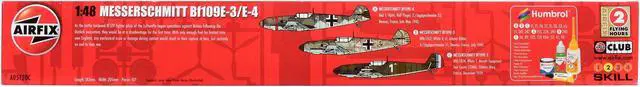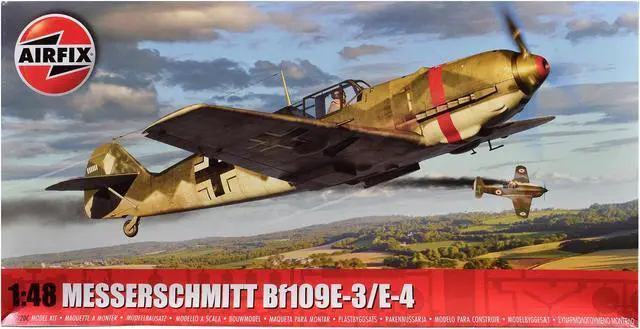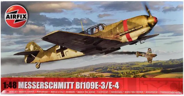 Brand new plastic model kit of Messerschmitt Bf109E-3/E-4 Fighter Aircraft with 3 Scheme Options (Level 2) 1/48 plastic model kit by Airfix.