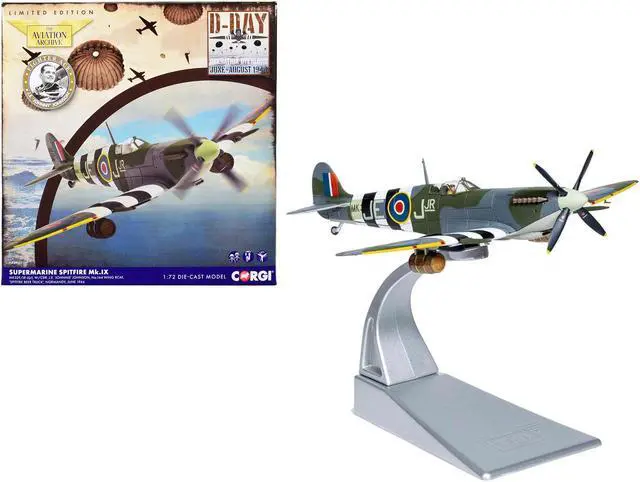 Brand new 1/72 scale diecast model of Supermarine Spitfire Mk. IX Fighter Aircraft with Commander J. E. "Johnnie" Johnson Figure, 144 Wing RCAF, "Spitfire Beer Truck" "D-Day Operation Overlord" Normandy (June 1944) "The Aviation Archive" Series die cast model by Corgi.
