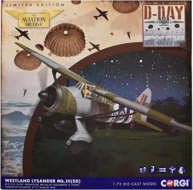 Brand new 1/72 scale diecast model of Westland Lysander Mk. III Aircraft "'Lucky' Newhouse, No. 161 Squadron" (1944) British Royal Air Force "The Aviation Archive" Series die cast model by Corgi.