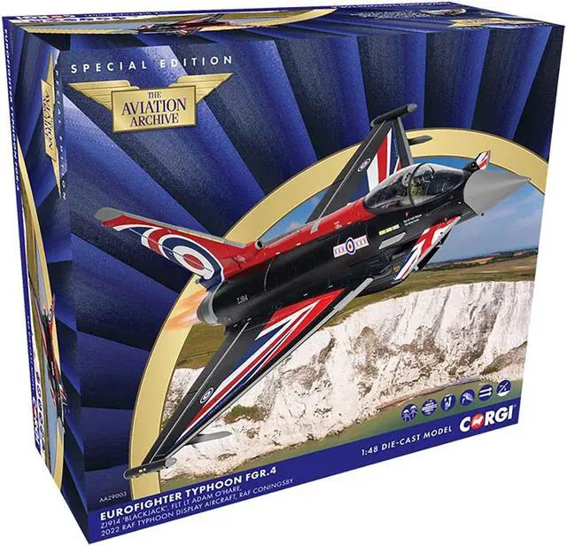 Brand new 1/48 scale diecast model of Eurofighter Typhoon FGR4 Aircraft "Blackjack, RAF Typhoon Display Aircraft" (2022) British Royal Air Force "The Aviation Archive" Series die cast model by Corgi.