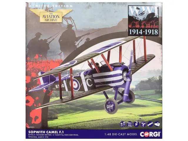 Brand new 1/48 scale diecast model of Sopwith Camel F. 1 Aircraft "B7190, Donner Wetter!, 'C' Flight No. 10 Squadron" (1918) Royal Naval Air Service "The Aviation Archive" Series die cast model by Corgi.