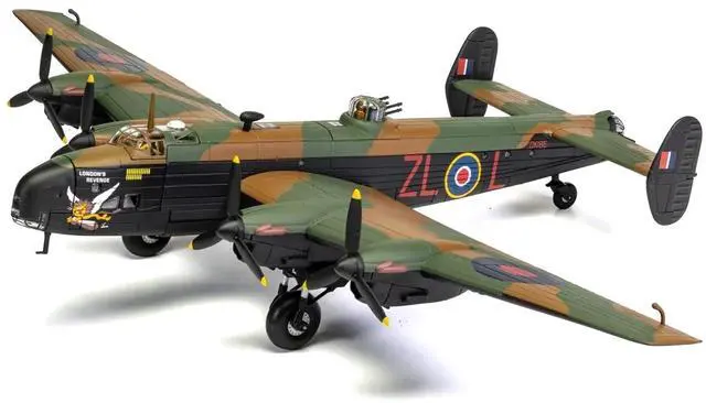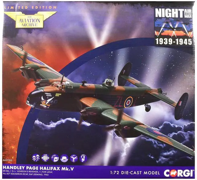 Brand new 1/72 scale diecast model of Handley Page Halifax MkV Bomber Aircraft "DK186, Londons Revenge - L for Lana, No. 427 Squadron, RAF Leeming" (1943) Royal Canadian Air Force "The Aviation Archive" Series die cast model by Corgi.