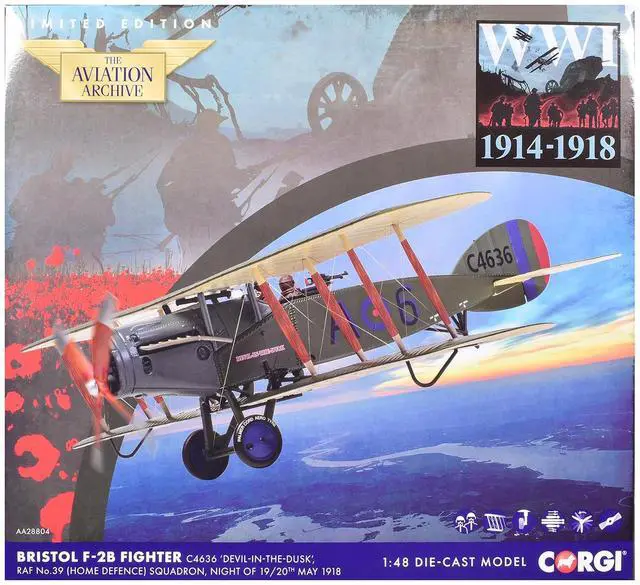 Brand new 1/48 scale diecast model of Bristol F-2B Fighter Aircraft "C4636, Devil-in-the-Dusk, No. 39 Squadron" (1918) Royal Flying Corps "The Aviation Archive" Series die cast model by Corgi.