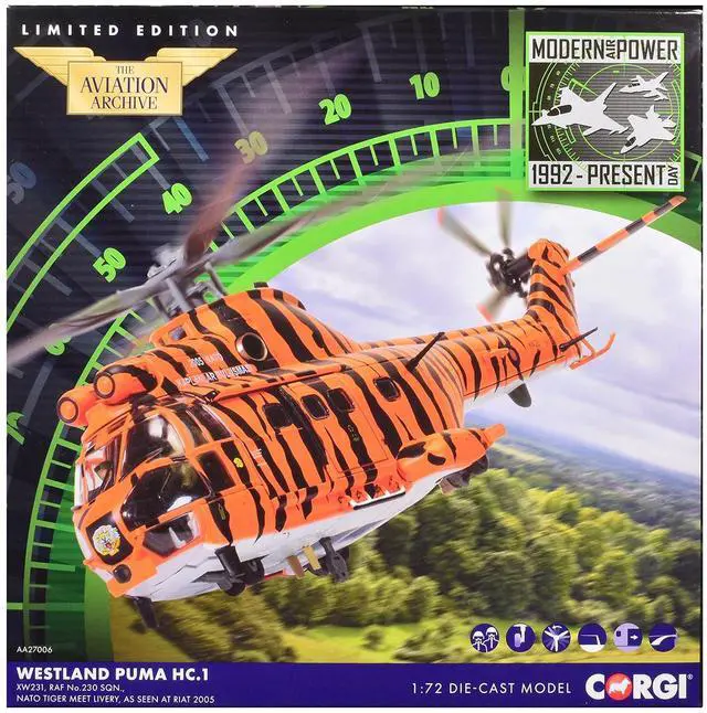 Brand new 1/72 scale diecast model of Westland Puma HC-1 Helicopter "No. 230 Squadron, NATO Tiger Meet livery, RIAT" (2005) Royal Air Force "The Aviation Archive" Series die cast model by Corgi.