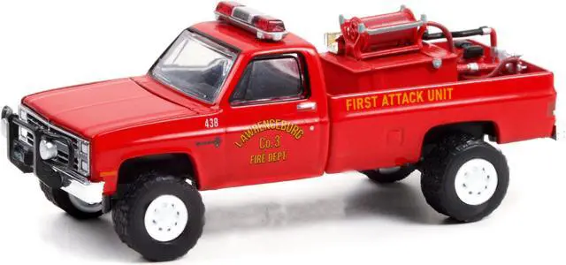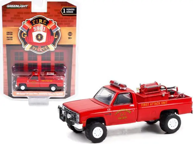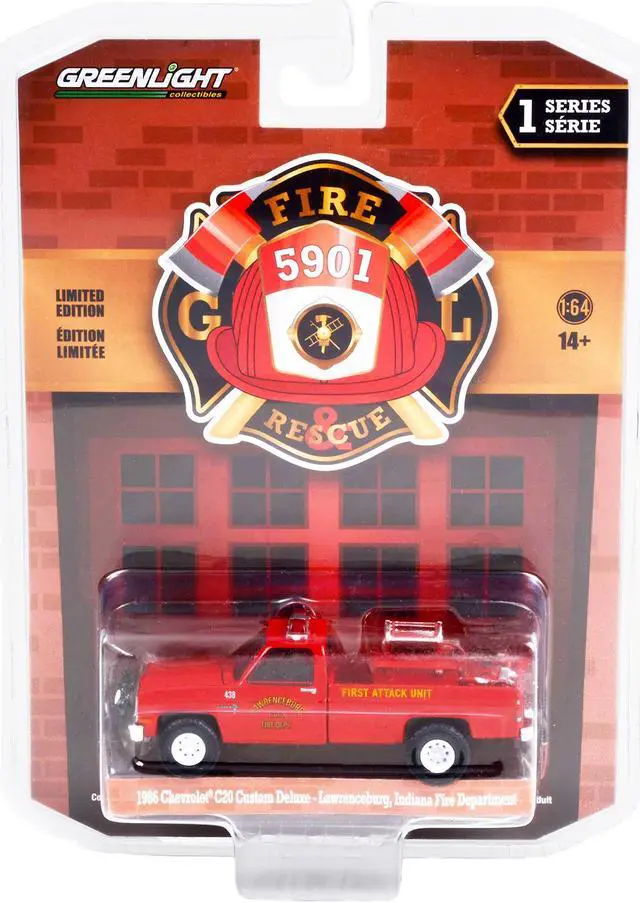Brand new 1/64 scale diecast car model of 1986 Chevrolet C20 Custom Deluxe Pickup Truck Red First Attack Unit with Fire Equipment, Hose and Tank "Lawrenceburg Fire Department" (Indiana) "Fire & Rescue" Series 1 die cast model car by Greenlight.