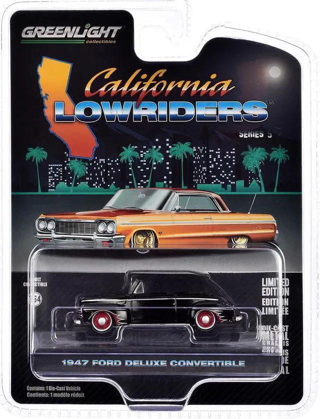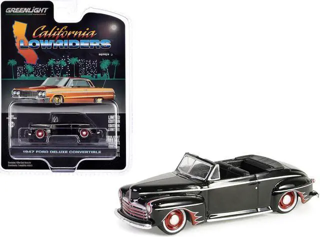 Brand new 1/64 scale diecast car model of 1947 Ford Deluxe Convertible Lowrider Black with Red Graphics "California Lowriders" Series 5 die cast model car by Greenlight.