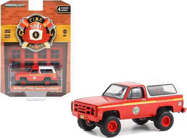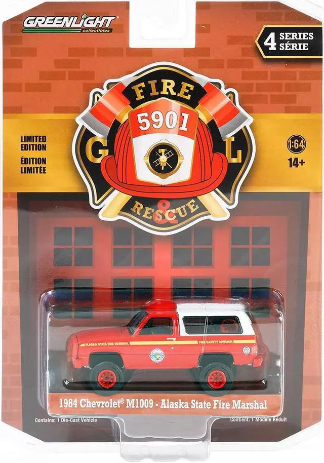 Brand new 1/64 scale diecast car model of 1984 Chevrolet M1009 Red with White Camper Shell "Alaska State Fire Marshal" "Fire & Rescue" Series 4 die cast model car by Greenlight.
