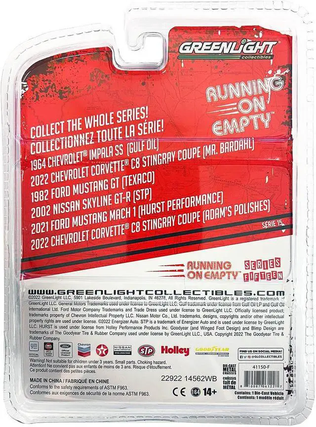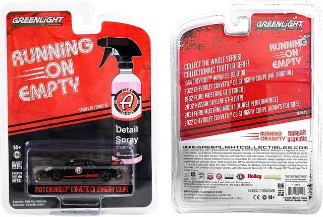 Brand new 1/64 scale diecast car model of 2022 Chevrolet Corvette C8 Stingray Coupe Black with Red Stripes "Adam's Polishes" "Running on Empty" Series 15 die cast model car by Greenlight.