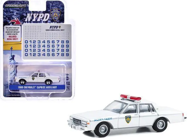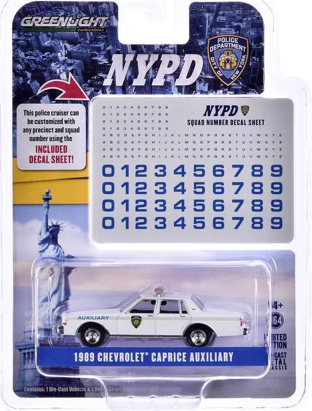Brand new 1/64 scale diecast car model of 1989 Chevrolet Caprice "New York Police Department (NYPD) " White with NYPD Squad Number Decal Sheet "Hobby Exclusive" Series die cast model car by Greenlight.